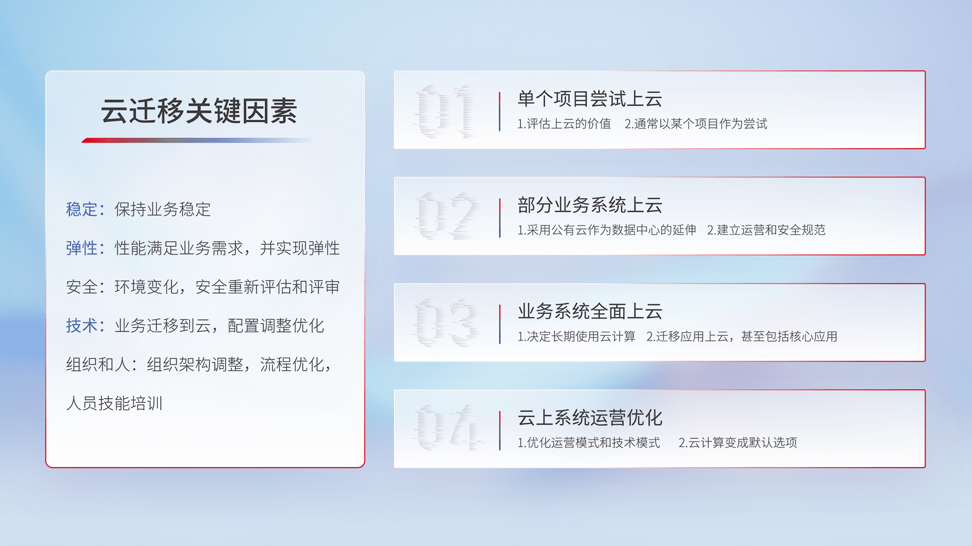 结合实际业务,,,,从规划设计、、、、云平台选型、、云原生改造、、、数据迁移、、、、集成交付,,,迁移全过程为客户识别最佳上云路径,,,做好风险识别管理,,设计网络架构、、、身份权限、、安全审计合规、、操作审计、、、、日志审计、、、、监控告警策略、、、多站点容灾设计等,,,对云上基础设施进行整体规划,,,,提升IT治理水平,,,,以满足弹性、、高可用、、、、高性能的需求。。。。