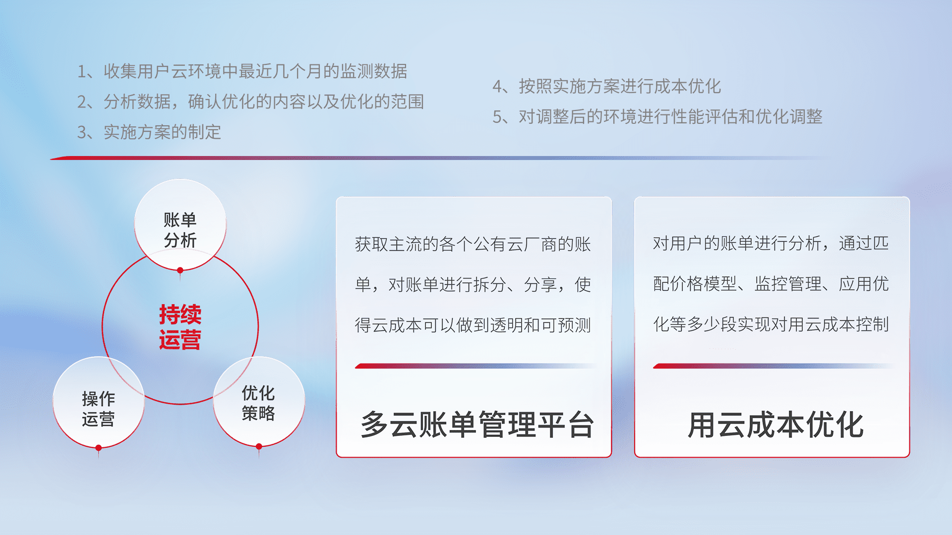 通过多云纳管,,,,以统一的资源数据模型把客户的云资源进行抽象和封装,,进而实现对多云资源的统一操作,,保障云资源管理的可靠性、、稳定性与可用性。。量身定制化运维内容,,配置、、开发运维、、补丁管理、、、备份、、、、监控、、、认证和访问管理、、、审计和日常巡检等,,,保障在用云过程中的可靠度,,,稳定度以及高可用率。。。。